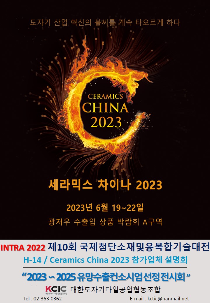 ÷´Ü¼ÒÀç ºñÁî´Ï½º Ç÷§Æû Àü½ÃȸÀÎ INTRA 2022(Á¦10ȸ ±¹Á¦Ã·´Ü¼ÒÀç À¶º¹ÇÕ±â¼úÀü)À» 10.26(¼ö) ~ 10.28(±Ý)±îÁö COEX 3Ãþ CȦ¿¡¼ °³Ãֵ˴ϴÙ.ÀÌ¿Í °ü·ÃÇØ¼, ¿ì¸® Á¶ÇÕÀº Áö³ 8¿ù Áß¼Òº¥Ã³±â¾÷ºÎ °ø°í(Á¦2022-404È£) 2023~2025³â À¯¸Á¼öÃâÄÁ¼Ò½Ã¾ö ÁÖ°ü´Üü ¸ðÁý °ø°í¿¡ Áö¿øÇÑ °á°ú, ¼¼¶ó¹Í½º Â÷À̳ª(CERAMICS CHINA) Àü½Ãȸ°¡ À¯¸ÁÀü½Ãȸ·Î 3³â°£ ¼±Á¤µÇ¾ú½À´Ï´Ù.ÀÌ¿¡ µû¶ó, COEX 3Ãþ CȦ H-14 ºÎ½º¿¡¼ ¼¼¶ó¹Í½º Â÷À̳ª 2023 Âü°¡¾÷ü ¼³¸í ¾È³»¸¦ Àü½Ãȸ ±â°£µ¿¾È ÁøÇàÇÏ¿À´Ï, °ü½ÉÀÖ´Â ¼¼¶ó¹Í ±â¾÷µéÀº ¹æ¹®ÇÏ¿© Áֽñ⠹ٶø´Ï´Ù.